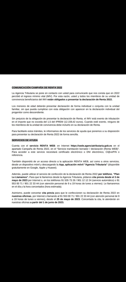 Hola buenas alguien me podria explicar esto. Tengo que hacer la declaración a la renta por el tema que cobramos el IMV . Pero hoy cuando la iva hacer me a saltado una notificación de la Agencia Tributaria como que tengo que declarar lo percibido del imv ... Os adjunto lo que me han notificado... Alguien me puede decir si lo tengo que declarar o como lo tendria que hacer... Gracias