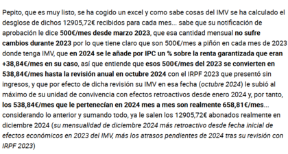 Pepito, que es muy listo, se ha cogido un excel y como sabe cosas del IMV se ha calculado el desglose de dichos 12905,72€ recibidos para cada mes... sabe que su notificación de aprobación le dice 500€/mes desde marzo 2023, que esa cantidad mensual no sufre cambios durante 2023 por lo que tiene claro que son 500€/mes a piñón en cada mes de 2023 donde tenga IMV, que en 2024 se le añade por IPC un % sobre la renta garantizada que eran +38,84€/mes en su caso, así que entiende que esos 500€/mes del 2023 se convierten en 538,84€/mes hasta la revisión anual en octubre 2024 con el IRPF 2023 que presentó sin ingresos, y que por efecto de dicha revisión su IMV en esa fecha (octubre 2024) le subió al máximo de su unidad de convivencia con efectos retroactivos desde enero 2024 y, por tanto, los 538,84€/mes que le pertenecían en 2024 mes a mes son realmente 658,81€/mes... considerando lo anterior y sumando todo, ya le salen los 12905,72€ abonados realmente en diciembre 2024 (su mensualidad de diciembre 2024 más retroactivo desde fecha inicial de efectos económicos en 2023 del IMV, más los atrasos pendientes de 2024 tras su revisión con IRPF 2023)