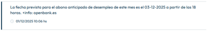 En un año que llevo cobrando con OpenBank - ni una sola vez cobramos antes de la fecha del mensaje. De hecho un mes fue "después" - si la fecha del mensaje es día 3 por ejemplo, siempre cobramos la madrugada del 2 al 3 - menos en Octubre que cobramos del 3 al 4.