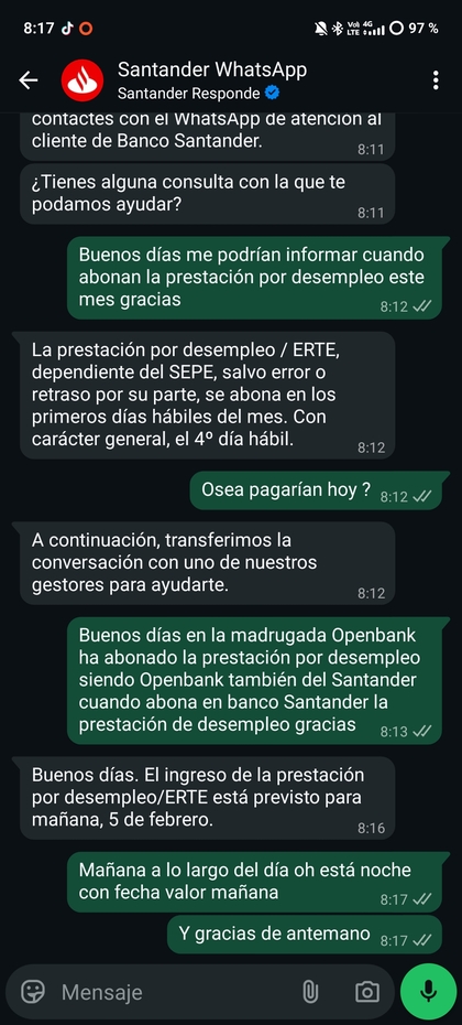 Buenos días. Openbank y Banco Santander somos del mismo grupo pero funcionamos como entidades independientes. En el caso de Banco Santander, el abono está previsto para mañana, día 5. Esto dice el whatsapp