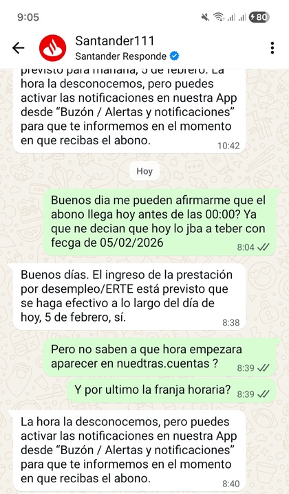 Pues nada, os cuento: me ha atendido una muchacha ya en tono subidito, imagino que no seré la primera que llama... la de ayer, al menos, fue más educada. Total, que lo primero que me ha dicho ha sido un embuste: que igual todavia no han recibido el dinero del SEPE. Le digo que sí, que sé que las transferencias estan emitidas desde el primer dia de mes. Entonces me suelta la segunda excusa: que se recibirá a lo largo del dia o si no mañana, que me espere. Le insisto en que su compañera me dijo que se abonaba el 4 dia habil y qie SANTANDER las transferencias de nómina, prestaciones, becas, etc, lo hace de noche por evitar loa flujos bancarios y que no haya incidencias ante este tipo de transferencias tan bestiales, y que, en consecuencia, que no me mienta, que por favor me diga si hay una incidencia o algo, y me insiste en que no, que mi información no es tal cual. Nada, es chocar contra una pared.