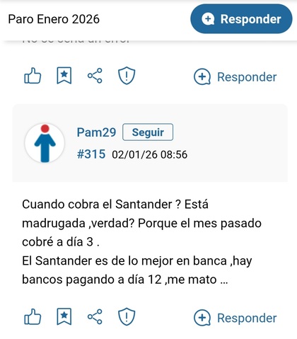 Es que esa persona lleva toda la mañana mintiendo. Nada mas que hay que ir al histórico de enero y ver que ella misma dice que cobró el 3 de enero. Y previamente, el 2 de enero, estaba preguntando que cuándo se cobraba. No sé que está intentando hacer, sinceramente. Es tan sencillo como irse a enero y ver que Santander abona la madrugada del 2 al 3, a unos antes, a otros despues. Pero es asi de sencillo y no hay más que mirar el mes pasado y el anterior en los hilos de este chat.