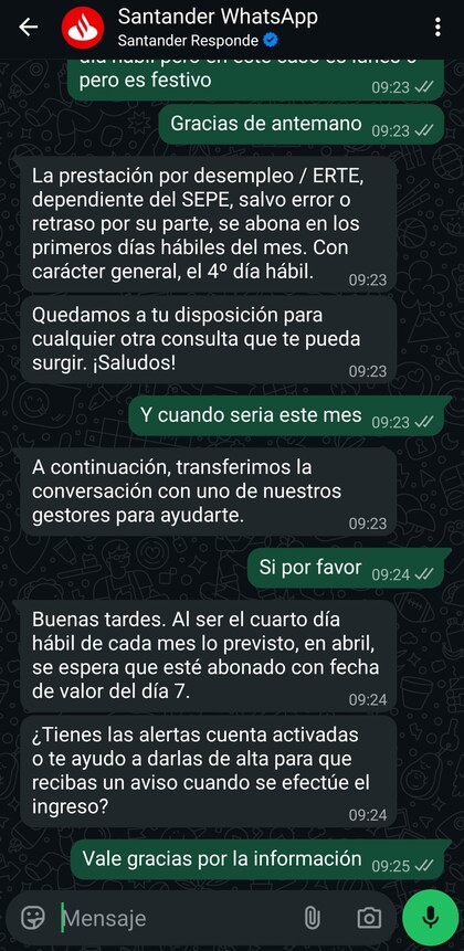 Es lo que queda. Santander procesará la transferencia el lunes porque el lunes es hábil, y la recibiremos en cuenta por la noche o madrugada, ya martes. Era una ilusión lo de que este mes lo hicieran antes del puente. En fin, salvo sorpresa de última hora y que nos encontremos el pago esta noche en cuenta, nos vamos al lunes de madrugada. Descansad y haya paz. Ya vendrán tiempos mejores...