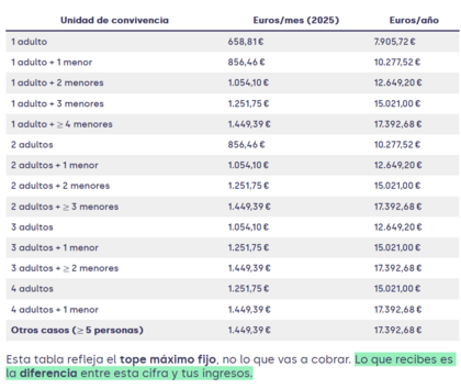 La renta garantizada (del IMV) es el importe máximo de IMV que una unidad de convivencia puede recibir durante el año en curso, en el caso de que no tuviese ingresos de ningún tipo el año anterior, tal como muestra la siguiente tabla para este 2025:(ojo, atención a lo remarcado en verde)