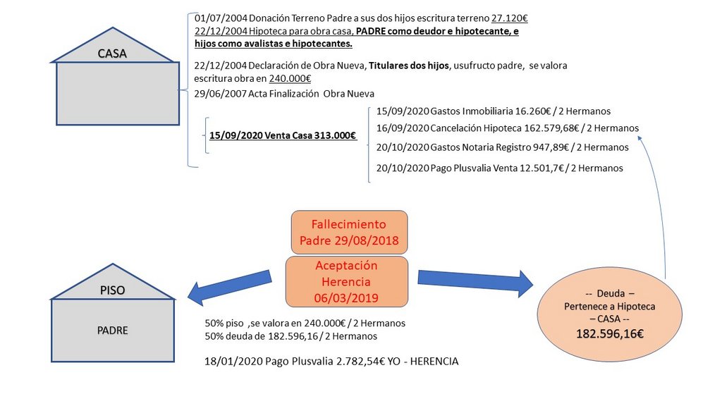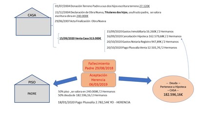 Según ese esquema hay una casa (que ya era vuestra, por donación del suelo), hay un piso, y hay una deuda. Recibís en la herencia el piso y la deuda. Vendeis la casa.
