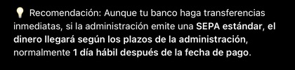 Lo dicen porque en al página pone que el pago lo pasan hoy. Pero el banco lo tramita y tarda un día. Aunque ha salido una ley que pone que las trasferencias tienen que ser inmediatas para la administración y para las tusas de las comunidades autónomas no cuenta.
