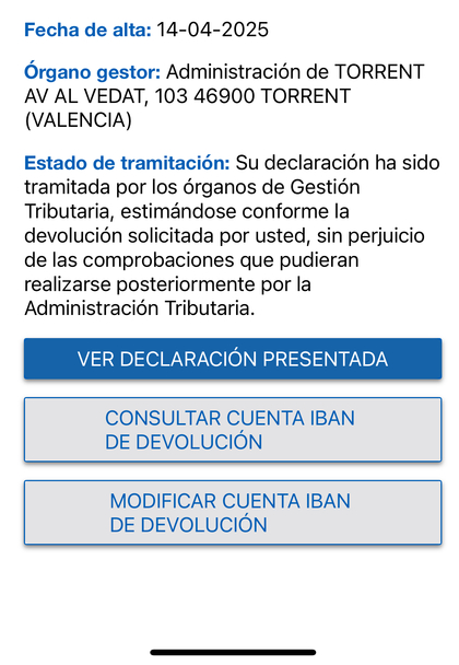 Desde el día 6 de abril en tramitando y hoy, 1 de diciembre por fin aparece el mensaje: Su declaración ha sido tramitada por los órganos de Gestión Tributaria, estimándose conforme la devolución solicitada por usted, sin perjuicio de las comprobaciones que pudieran realizarse posteriormente por la Administración Tributaria.