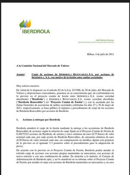 Canje en la fusión de Iberdrola Renovables e Iberdrola