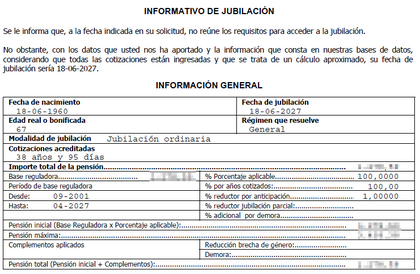 Lo curioso es que en la notificación también se indica que no reúno los requisitos para acceder a la jubilación. He pedido cita en la Seguridad Social para que me aclaren la notificación.