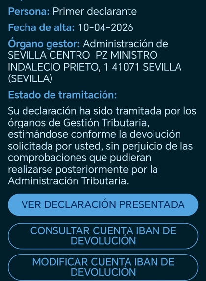Su declaración ha sido tramitada por los órganos de Gestión Tributaria, estimándose conforme la devolución solicitada por usted, sin perjuicio de las comprobaciones que pudieran realizarse posteriormente por la Administración Tributaria.
