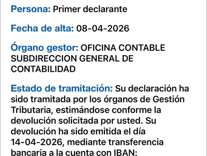 La mia individual ya esta en cuenta ingresa esta mañana, 654 euros, la mi mujer que es conjunta, desde el dia 8, hoy por fin se ha movido el estado y me pone que la declaración esta conforme, es conjunta y 1564 a devolver, oficina de La Laguna, en Tenerife.