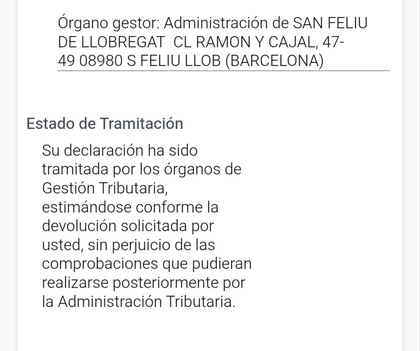 Tributaria, estimándose conforme la devolución solicitada por usted, sin perjuicio de las comprobaciones que pudieran realizarse posteriormente por la Administración Tributaria. Gracias