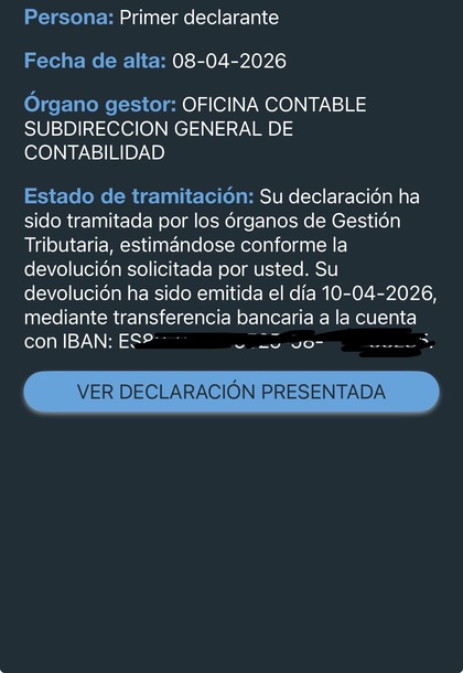 Yo por experiencia, ojo que es exclusivamente por otros años y hablo exclusivamente de lo que a mí me pasó cuando pasó de tramitada a comprobada o me quitaron parte o me la quitaron entera pero ojo, lo he colgado antes, el año pasado ni pasó a comprobada, yo ya esperando los 1200 y me los quitaron por un expediente de un juzgado. Y no sé xq me dió x mirarlo y llamar, venía de algo con barra/18 y llamé y se habían equivocado. Increíble pero cierto. Al día siguiente fui al juzgado, me hicieron un papel y directo al Santander pero es que me devolvieron más de 1400, era de algo que no sólo estaba pagado, me habían quitado de más y sí no es xq me e dió x llamar, 1200+200 y pico para ellos