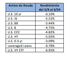 La tabla muestra peor comportamiento del bono10Y US,comparado al HY y al bono con grado de inversión.