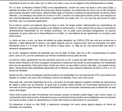 " Es al menos curioso que bajando tipos los tipos a corto, los largos suban, básicamente por expectativas de inflación más altas, y que estas subidas no se reflejen en estos bonos. Y más cuando hemos visto un movimiento absolutamente disparatado en los metales preciosos, con la plata como principal protagonista, se supone amparado en gran parte por la desconfianza en el dólar, lo cual debería de ser igualmente un revulsivo para estos bonos.