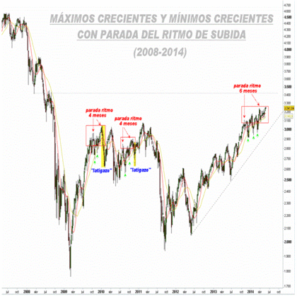 Tanto en el gráfico superior como en el inferior podemos ver sendos ejemplos históricos de parada en el ritmo de las subidas, con estructuras de mínimos y máximos crecientes. En todas ellas se resuelven esas situaciones con fuertes caídas antes de reemprender las alzas