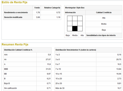 Buenas tardes, soy nuevo en el tema y me gustaría saber si alguien más entendido me puede indicar como encontrar el style Box de renta fija de los fondos mixtos, si es que es posible. En los fondos de renta fija puros si los encuentro en morningstar y en los mixtos encuentro igualmente el style Box pero de la parte de renta variable pero no de la parte de renta fija. El quererlo saber es por comprobar que exposición tiene la parte de R.F de esos fondos mixtos a los cambios de tipos de interés. Concretamente estoy buscando los del parenturn cartesio income y los del M&G optimal income.