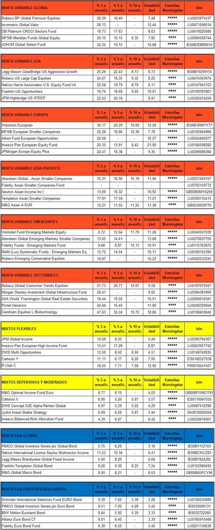 Aunque hecho en falta la categoria de RV Global Alto Dividendo, muy apreciada por los fondistas con perfil moderado, que apreciamos el mandato de preservacion de capital, pero no renunciamos a la inversion en Renta Variable.