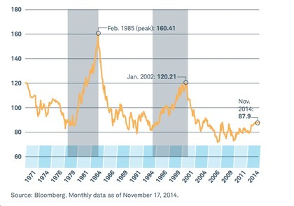 A pesar de la subida del dólar index DXY este 2014 , está muy lejos de alcanzar cotas de máximos como se observa en el gráfico de abajo.