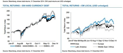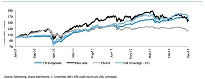Las divisas de los mercados emergentes se depreciaron frente al dólar estadounidense en el último cuatrimestre. La subida de tipos de interés prevista por la FED en 2015 junto con la caída en el precio del petróleo ayudaron a la apreciación de la moneda estadounidense, puesto que las divisas de los países dependientes del petróleo cayeron (Venezuela, Russia, Ukraine..). Rusia sale perjudicada por el precio del crudo y el rublo tocó mínimos históricos. Por el contrario, las divisas de los países importadores de energía se comportaron mejor (India, Turquía....).
