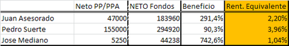 D. Pedro es el más afortunado, y para quien teóricamente los PP/PPA son rentables porque desgrava mucho del IRPF (¡El 45% de lo aportado!). Aún y así, y teniendo en cuenta que ha tenido la fortuna o la buena elección de elegir unos de los 10 mejores fondos disponibles entre 1359 comercializados en España. Su rentabilidad neta tras impuestos sumando ahorros es 155000€. No está mal, pero la rentabilidad neta anual se queda en el 3.3%.
