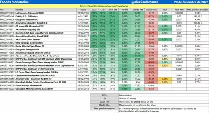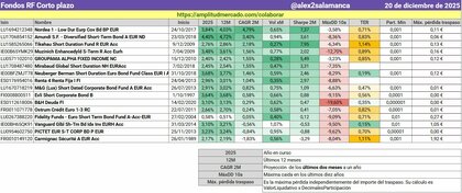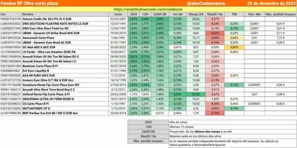 Actualización de navidad de tablas de fondos monetarios, RF Ultra Corto Plazo y RF Corto Plazo. Ordenados por la rentabilidad proyectada basándose en la rentabilidad de las últimas semanas Fuente Alex2Salamanca en X