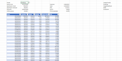 He creado un excel con la intencion de poder hacer simulaciones de como se hubiera comportado nuestra inversion en un determinado fondo si la hubieramos hecho en una fecha concreta y hubieramos ido haciendo aportaciones mensuales hasta la fecha de fin.