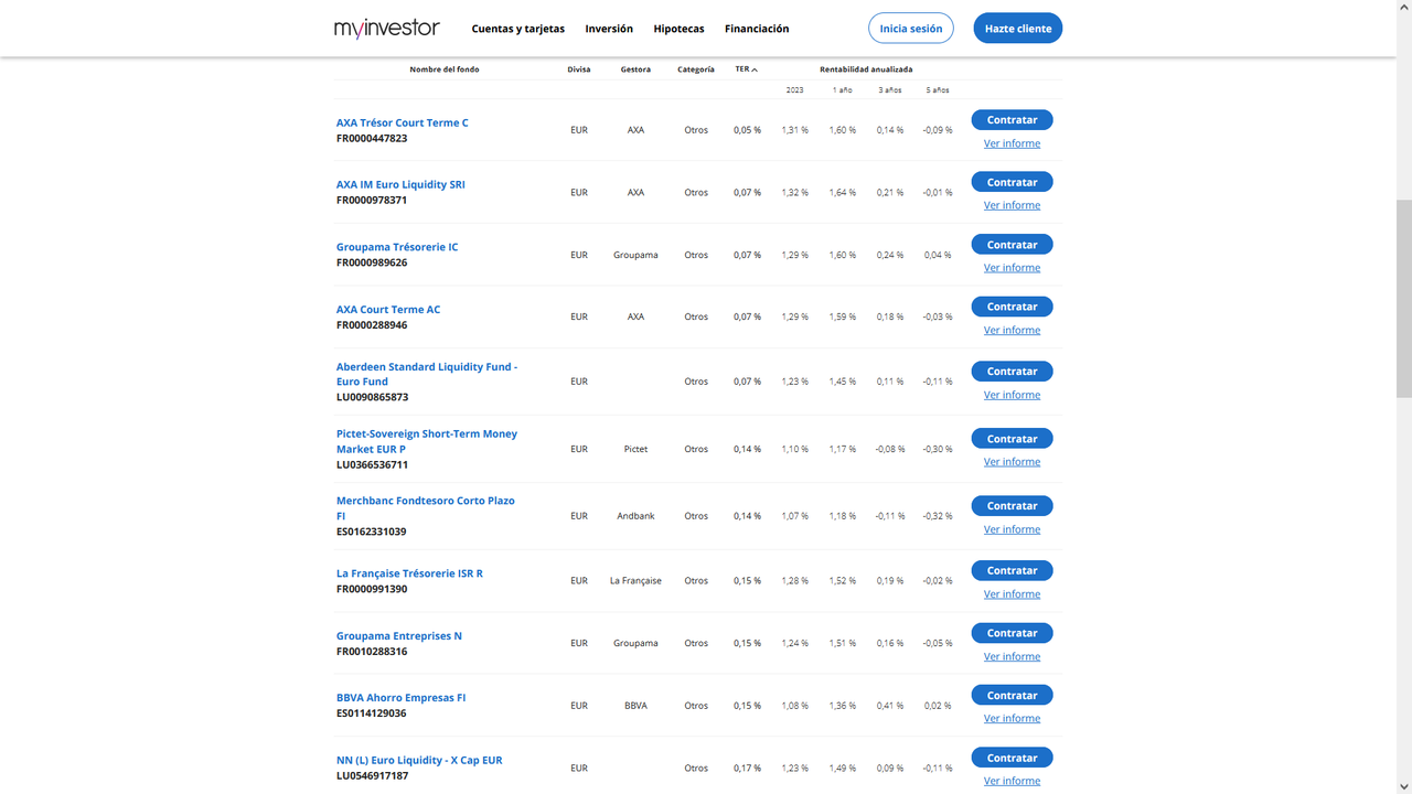 Aqui pongo la lista de monetarios en MyInvestor con TER por debajo de 0.15%: