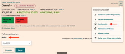 Aunque tu Fondo esté denominado en USD, puedes configurar en "FT" para que te muestre siempre el valor de tu Cartera en Euros.