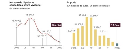 La venta de viviendas ha caído de forma alarmante, según los datos publicados por el INE en marzo se realizaron alrededor de 16.270 hipotecas de 100.000 que se realizaban en los años anteriores a la crisis (2004-2007), es decir, casi un 87% menos que en estos años.