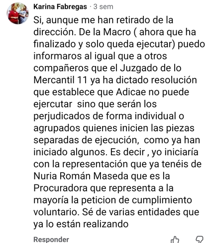 Entiendo que tienes permiso de Karina...si no, ten cuidado porque te podrias meter en un lio A ver, nos viene bien toda la info, pero no hace falta saltarse la voluntad o los derechos de terceros, que no digo que sea el caso, pero no lo necesitas. Con repetir esa explicacion y tu fuente nos llegaria igual, vale? Es que si fueras de Adicae, entenderia que lo reenviaras, pero como has dicho que no lo eres...Gracias igual.