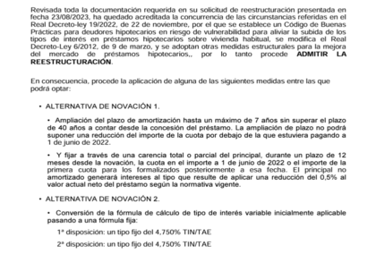 Me encuentro en la siguiente situación y necesitaría orientación sobre la decisión a tomar. Mi marido y yo somos propietarios de nuestra vivienda habitual, adquirida en julio de 2005 y sobre la que tenemos pendiente de pago unos 80.000 euros de hipoteca (30 años). Nuestra cuota actual es de casi 750 euros (revisable anualmente cada agosto). Nos encontramos en una situación de desempleo, percibiendo un Ingreso Mínimo Vital para nuestra unidad familiar de casi 700 euros. Contactamos con nuestro banco para ver qué opciones podríamos conseguir para aliviar la situación y poder seguir atendiendo nuestra hipoteca un poco menos ahogados. Nos hablaron del código de buenas prácticas y tras la presentación de toda la documentación que nos solicitaron nos dan 2 opciones.