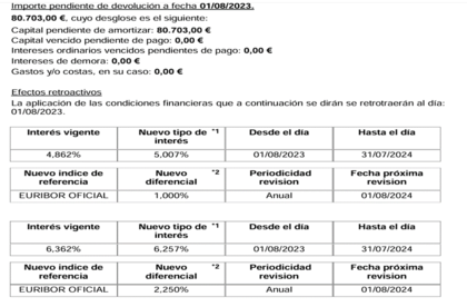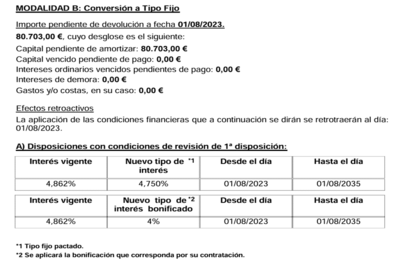 Les adjunto documento con las alternativas que nos ofrecen (y la 3ª de no aceptar estas propuestas). Debemos dar la contestación en estos días. Estamos bastante desbordados con tanto número. Agradeceríamos inmensamente cualquier aclaración u orientación que nos pudiesen dar. Con las continuas informaciones sobre el euribor que vemos y la incertidumbre de lo que pueda pasar en años posteriores, nos sentimos perdidos. Disculpen la calidad de las capturas, no nos fue posible ofrecerles la información de otra forma.