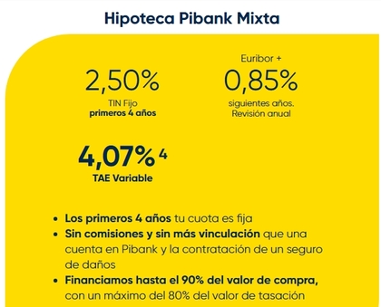 He leído mucho en los foros y preguntado a amigos y familiares, pero quiero agotar la última bala.. ¿con qué hipoteca me quedo? Actualmente tengo la hipoteca en PIBANK y la voy a modificar o por las nuevas condiciones que da el banco para todos los clientes o me marcho a ING ya que me han realizado el estudio y la tengo aprobada. La cuestión es estar seguro.... Pibank es esta que anuncian en la web: