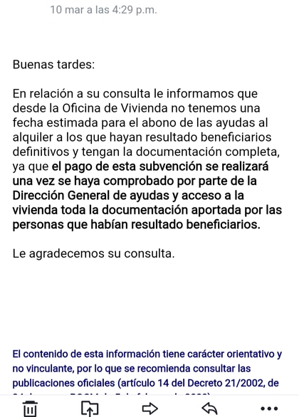 Yo creo que la queja tambien deberia ir al organo del gobierno de donde sale el dinero de la ayuda, que es Plan Estatal de Vivienda para que revisen qué es lo que pasa en Madrid. Hay que chivarse con el que paga el dinero y con el que lo administra. Pienso yo que asi hacemos mas presion...o que creeis?