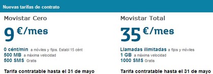 Tal y como anunciaba algún rankiano hace unos días, ya han llegado las nuevas tarifas de Movistar. *Tarifa Contrato Movistar Cero.Cuota mensual 9€. 0.15€ establecimiento de llamada. Llamadas a fijos y móviles nacionales a 0€/min. 500MB gratis (por 10€ más tienes 1GB adicional). 500 sms gratis. Permanencia 18 meses (penalización de 100€ para bajas anticipadas). Alta en la tarifa gratuita para portabilidades, altas nuevas y paso de tarjeta a contrato. Para cambios de otro contrato a la Tarifa Contrato Movistar Cero, el coste es de 15€. *Tarifa Contrato Movistar Total. Cuota mensual 35€. 7.000 min/mes gratis en llamadasa fijos y móviles nacionales, establecimiento incluido. 1GB gratis(por 10€ más tienes 1GB adicional. 1.000 sms gratis. Permanencia 18 meses (penalización de 100€ para bajas anticipadas). Alta en la tarifa gratuita para portabilidades, altas nuevas y paso de tarjeta a contrato. Para cambios de otro contrato a la Tarifa Contrato Movistar Total, el coste es de 15€.
