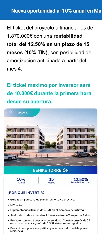 • Equipo gestor con experiencia: La sociedad matriz del promotor tiene experiencia demostrada en promociones residenciales y ha colaborado previamente con la plataforma.