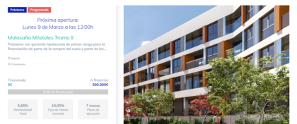 Se trata de un préstamo con garantía hipotecaria de primer rango destinado a financiar parcialmente la compra de un suelo urbano en el centro de Torrejón de Ardoz (Madrid), para el desarrollo de un complejo residencial de obra nueva de 55 viviendas con plaza de garaje y trastero.