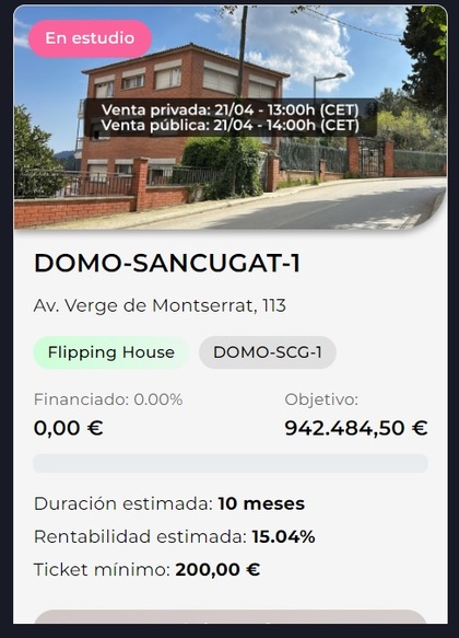 Ya que últimamente parece que el hilo está más animado y, creo que no está la plataforma domoblock, aprovecho para poner la última oportunidad en San Cugat (DOMO-SANCUGAT-1) 10 meses al 15,05%, ticket mínimo 200€.