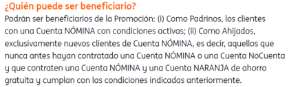 nunca antes hayan contratado una Cuenta NÓMINA o una Cuenta NoCuenta y que contraten una Cuenta NÓMINA y una Cuenta NARANJA de ahorro gratuita y cumplan con las condiciones indicadas anteriormente.