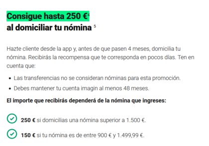 Si domicilias tu Nómina por importe superior a 1.500€, recibirás un incentivo de 250€ netos. Permanencia domiciliación de nómina 24 meses + 24 meses con un saldo de 50€ en cuenta. No te olvides de activar el bizum y dejar 50€ en la cuenta.