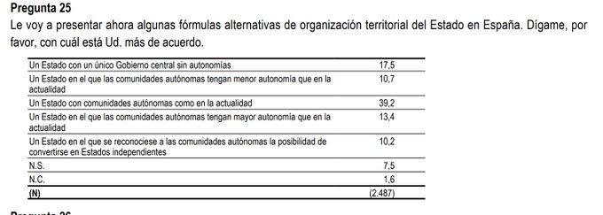 Estaría bien saber el desglose territorial de esa pregunta y respuestas, aunque es bastante previsible. En Catalunya y Euskalherria seguro que son las opciones 4 y 5 las mayoritarias. En las "regiones" de España, deben prevalecer las opciones 1 y 2. Y en el resto, lo que serían las "regiones con cartacter +/- de nacionalidad" prevalecerá la respuesta 3.