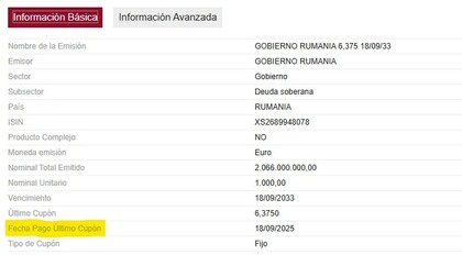 El ISIN es XS2689948078...deberían haber pagado hoy. Lo que ya no sé si es problema de TR o de Rumanía.
