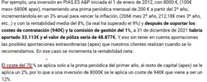 • "Y valora invertir en fondos de gestión activa, o sencillamente Unit Link, que los hay sin gastos. Y eso es lo más importante". No es cierto porque no hay productos de inversión sin gastos. Y comete un grave error cultural. Lo barato no es mejor. Según esa afirmación sería mejor un producto que garantice una rentabilidad del 1,7% sin gastos, que un PIAS/Unit Linked que obtenga una rentabilidad del 13,93% con un coste de gestión del 1%, como es el caso del Estrategia 5 de Aegon.