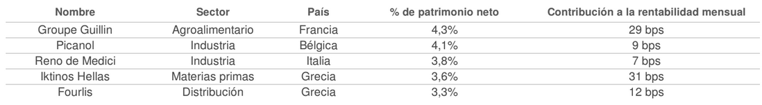 La empresa griega de producción de mármol Iktinos fue la principal contribución a la rentabilidad este mes. Durante la reciente junta general celebrada el 26 de junio, la dirección reiteró sus objetivos de crecimiento del 10% en 2019, pese a un comienzo de año complicado. Este comentario nos parece alentador teniendo en cuenta la meteorología adversa que ha sufrido Grecia este invierno, que derivó en la ralentización del ritmo de extracción de mármol en la región de Drama. La subida anunciada del dividendo constituye asimismo una señal de confianza en las perspectivas de crecimiento a medio plazo, que seguirán alimentadas por la puesta en servicio de la nueva planta de despiece de bloques, así como por las recientes adquisiciones de canteras.
