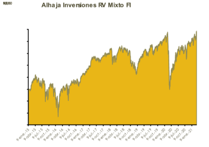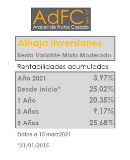 Asesoramos este fondo de una manera moderada, sin asumir grandes riesgos y con la volatilidad controlada. Una volatilidad inferior a la media del mercado, y con el que estamos consiguiendo una rentabilidad anualizada en torno al 5% a 5 años. Actualmente, a cierre de 15 de marzo 2021, nadie que haya invertido en Alhaja está perdiendo dinero.