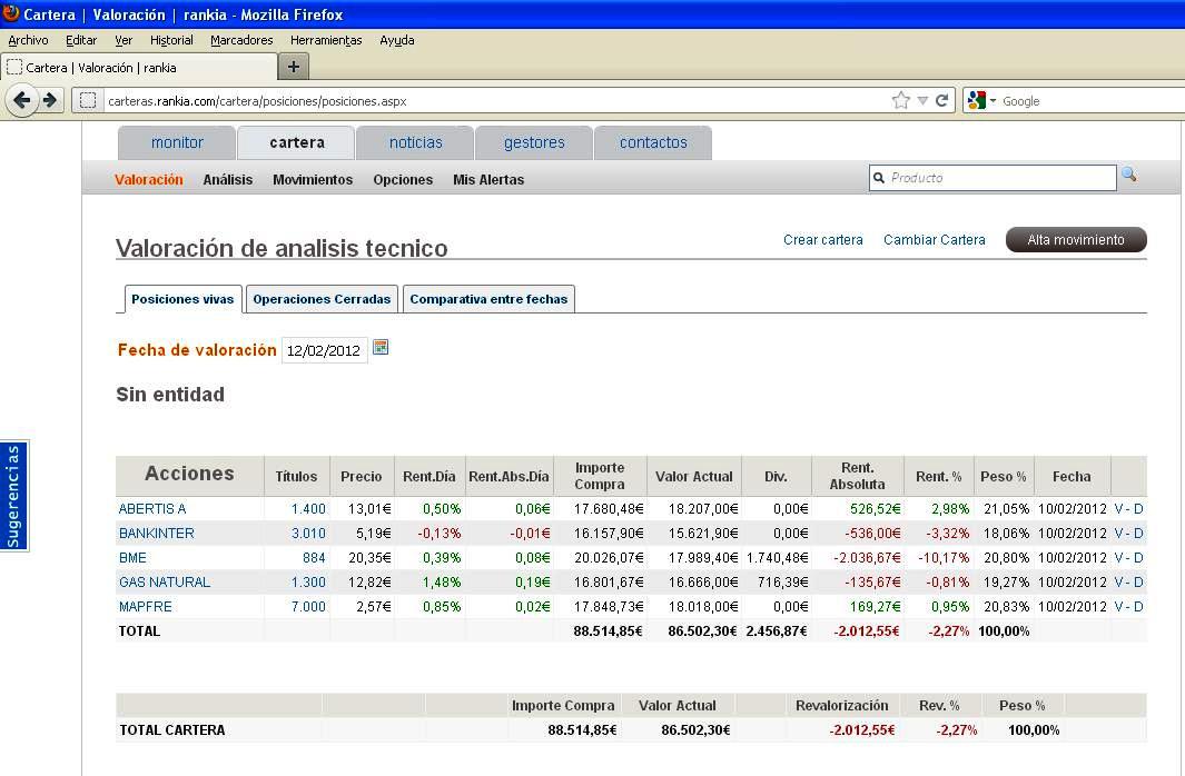 Para estudiar la rentabilidad, a la perdida de 2.012€ debemos añadir el beneficio o perdida generado en las operaciones cerradas y los dividendos cobrados, para lo cual podemos usar esta página: