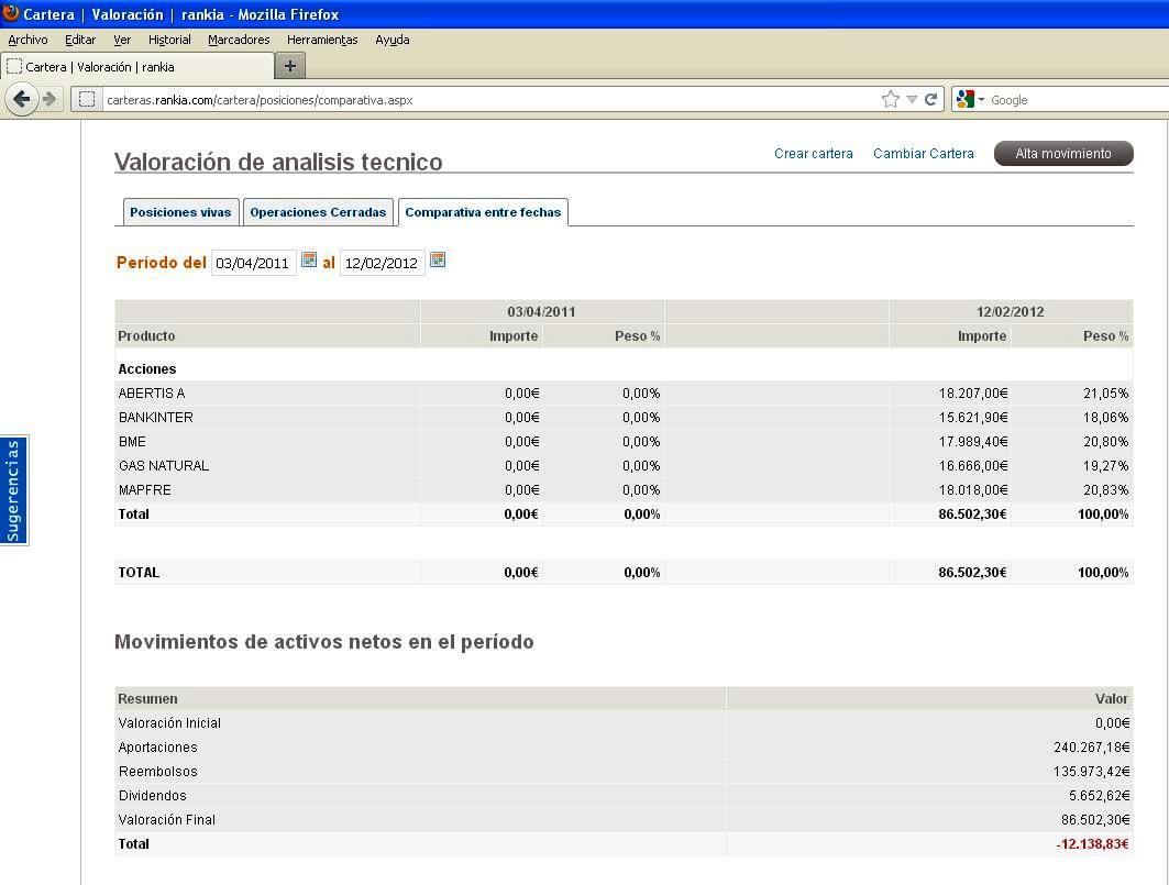 En resumen vemos que tenemos una perdida de 12.138€ en este periodo lo que supone una perdida del 12,14%.