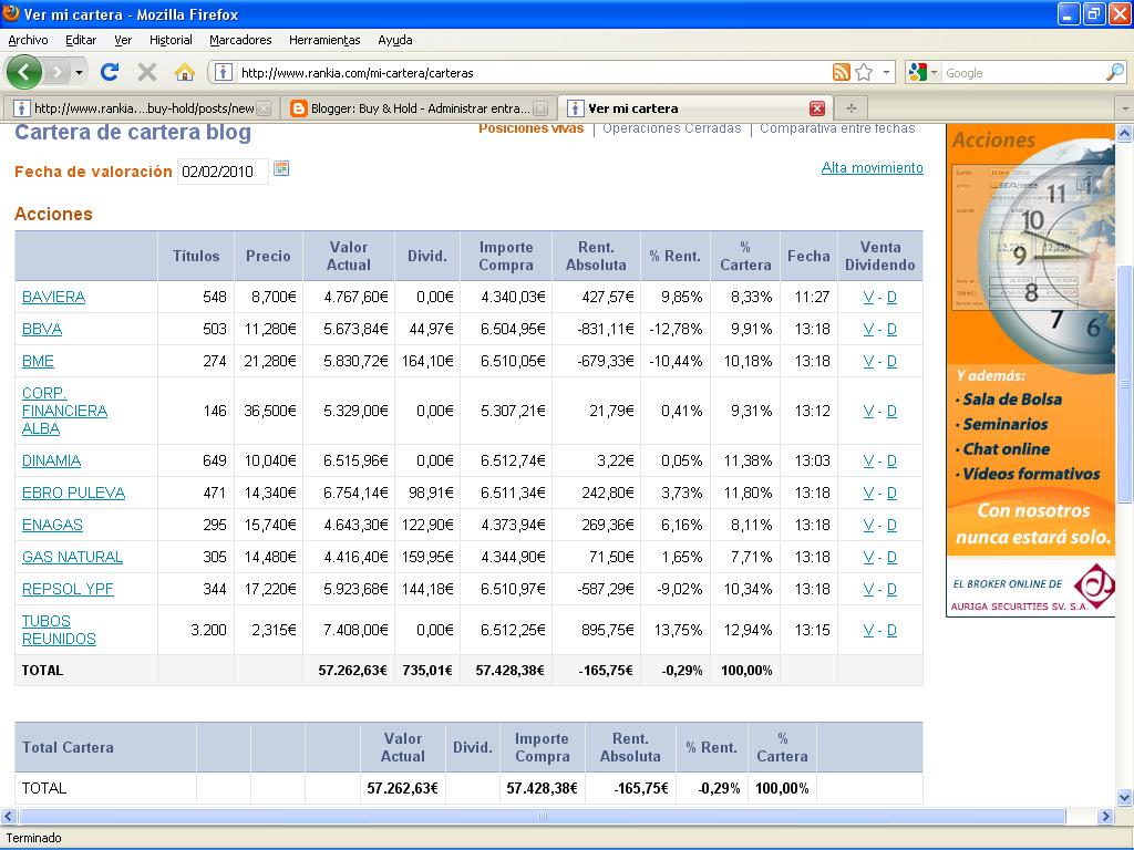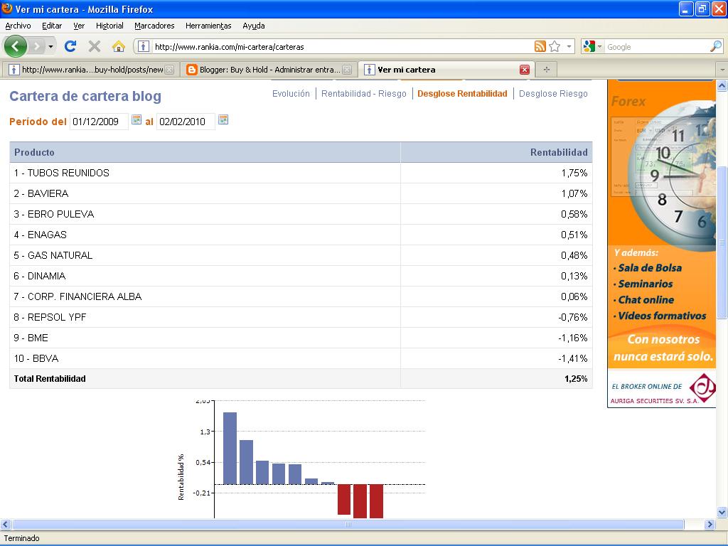 Respecto a la volatilidad de nuestra cartera, solo hay que ver el gráfico de la evolución, para comprobar como obtenemos una mayor rentabilidad, con una menor volatilidad, por lo que podemos seguir diciendo que estamos consiguiendo los dos objetivos planteados, mayor rentabilidad y menor volatilidad que el ibex.