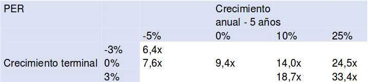 En el eje horizontal de la Tabla, se muestra el crecimiento anual de los beneficios de la empresa durante los próximos cinco años y en el eje vertical el crecimiento perpetuo de la empresa a partir del quinto año. Por ejemplo, una empresa cuyos beneficios vayan a caer un 5% al año durante los próximos cinco años y que a partir del quinto año los beneficios se reducirán un 3% al año de forma permanente, estaría correctamente valorada a un PER de 6,4 veces. En el otro extremo, una empresa cuyos beneficios van a crecer un 25% durante los próximos cinco años y que a partir de entonces sus beneficios crecerán de forma perpetua al 3% (en línea con la economía) está correctamente valorada a un PER de más de 33 veces. Incluso si la empresa crece sus beneficios un 25% al año durante cinco años y a partir del quinto año ya no crece más, estaría correctamente valorada a un PER de 24,5 veces.